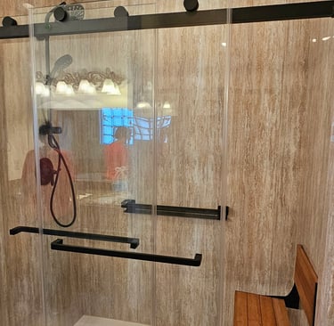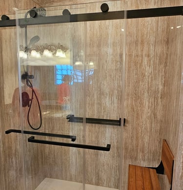 Converted this tub into a sleek walk-in shower with acrylic panels and safety grab bars, all installed in just one day.